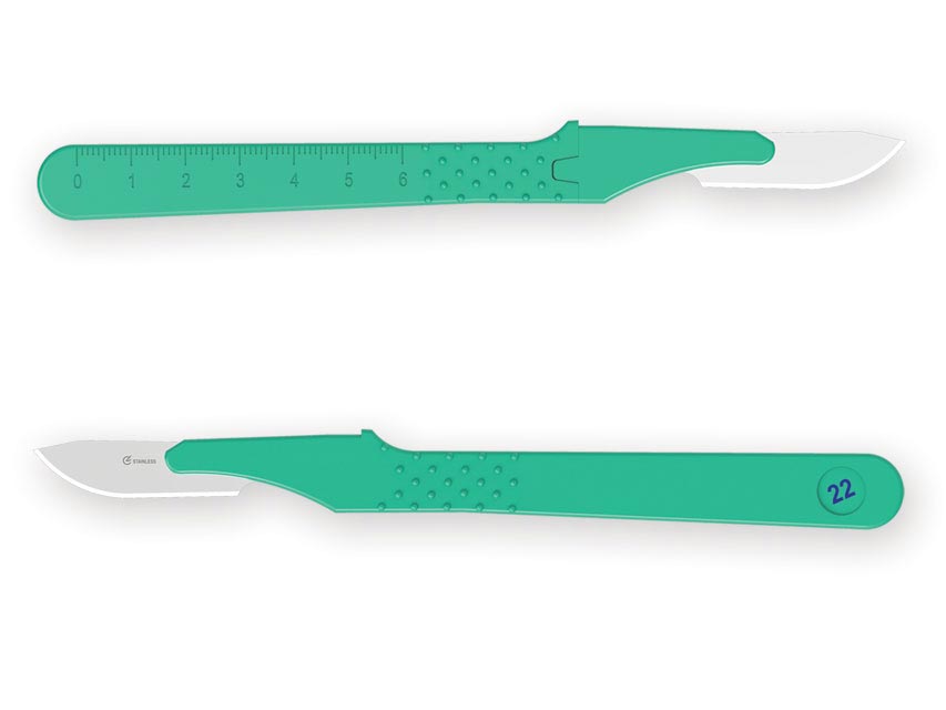 Bisturí estéril desechable de seguridad de acero inox n. 22. Línea de bisturí con hojas de acero inox soldadas dentro