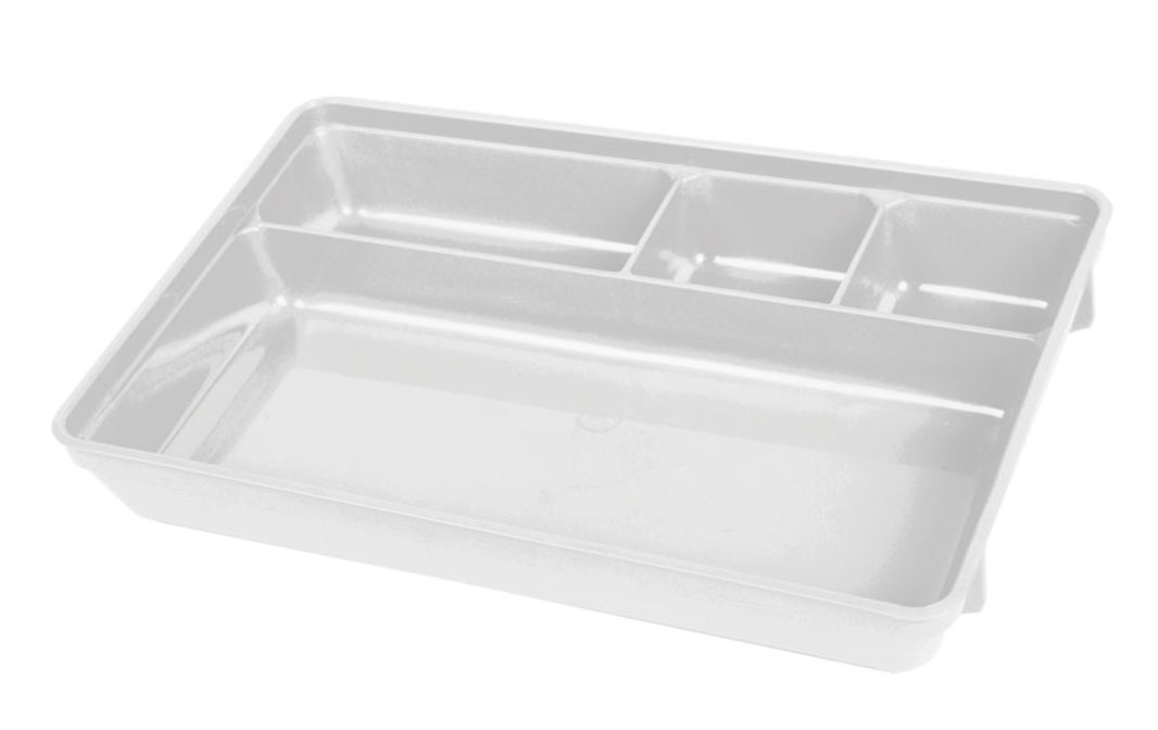 Bandeja con compartimentos de polipropileno, fácil de limpiar y resistente a la mayoría de los productos químicos.