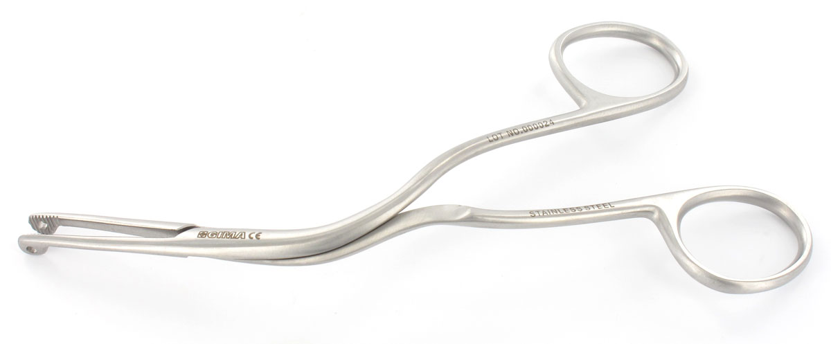 Pinza articulada en tijera de acero inoxidable con mango de bayoneta, curva a lo largo del eje y extremo distal estriado en forma de anillo excéntrico.