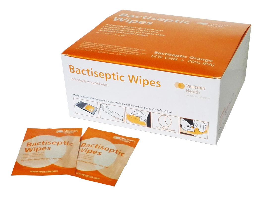 Cajas de 150 sobres individuales impregnados con Bactiseptic Orange.