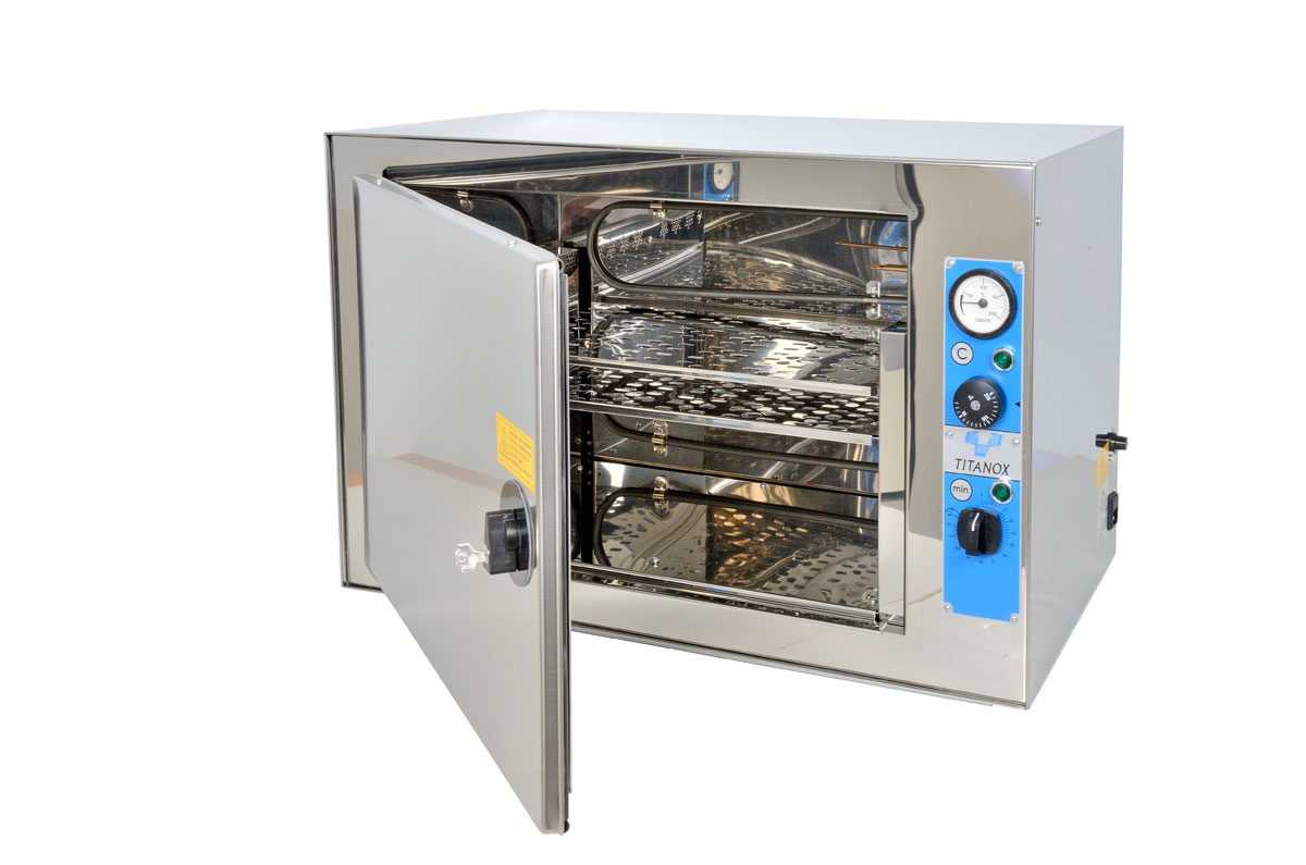 Esterilizador eléctrico con caja externa, parte anterior y puerta fuertemente aislada de acero inoxidable.