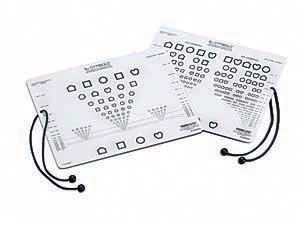 Test, en formato card, que mide la agudeza visual de cerca, caracterizado por una parte frontal, con símbolos colocados sobre líneas espaciadas proporcionalmente, y con la parte de atrás donde las líneas tienen espaciados reducidos del 25% y 50%.