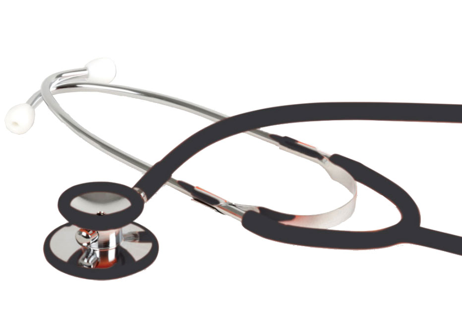 Fonendoscopio para adultos con auricular cromado, aro quitafríos, arco con muelle externo y acabado del mismo color que el tubo. En caja de cartón.