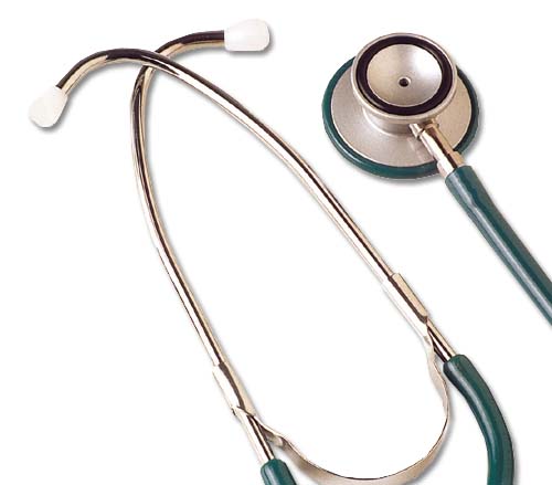 Fonendoscopio para adultos con auricular en aleación de zinc "Duracote" aislante, aro quitafríos, arco con muelle externo y tubo de color verde a juego con el color del anillo. En caja de cartón.