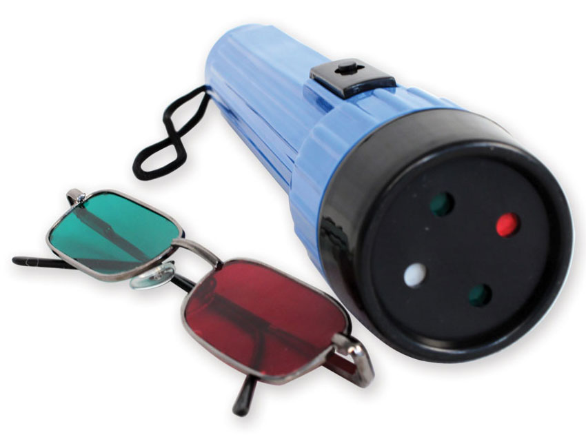 Con la corrección adecuada para lejos o cerca, colocarse las gafas rojo verde con el filtro rojo en el ojo derecho.