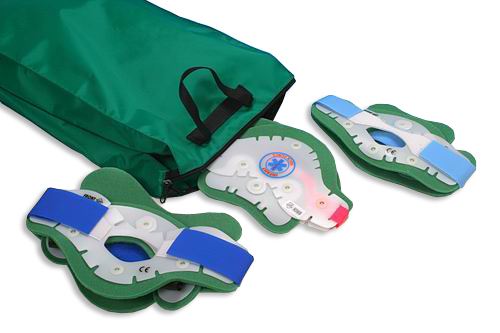 Set de 6 collarines a componente doble, con estructura de polietileno. Revestimiento interior lavable de EVA (células cerradas), sujeto a la parte de plástico mediante remaches de plástico. Los orificios pequeños garantizan una transpiración adecuada. Orificio traqueal para efectuar la traqueotomía. Mentonera anatómica extraíble. Cierre regulable de velcro.
