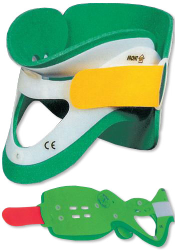Collarín cervical de una pieza para adultos (cuello largo), con estructura de polietileno. Revestimiento interior lavable de EVA (células cerradas), sujeto a la parte de plástico mediante remaches de plástico. Los orificios pequeños garantizan una transpiración adecuada. Orificio traqueal para efectuar la traqueotomía. Mentonera anatómica extraíble. Cierre regulable de velcro.
