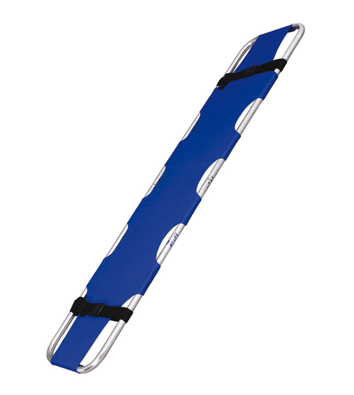 Camilla plegable, ligera y de pequeñas dimensiones que se transporta con facilidad. Estructura de aluminio y tela de nailon impermeable con revestimiento de vinilo.