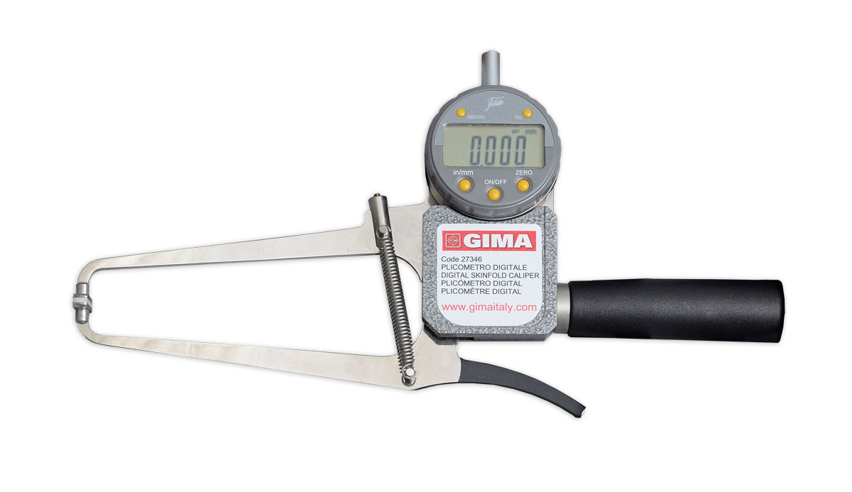 Aparato digital de alta precisión para medir el espesor de la grasa subcutánea y determinar la cantidad total de grasa de un sujeto. Fabricado con arreglo a las normas internacionales, el plicómetro Gima consta de varillas articuladas que ejercen una presión de 10 g/mm2 sobre los pliegues cutáneos y de una escala milimétrica exacta para medir el espesor de la grasa. La posibilidad de ajustar la presión que ejerce evita los problemas que ocasiona el aflojamiento del muelle a lo largo del tiempo.