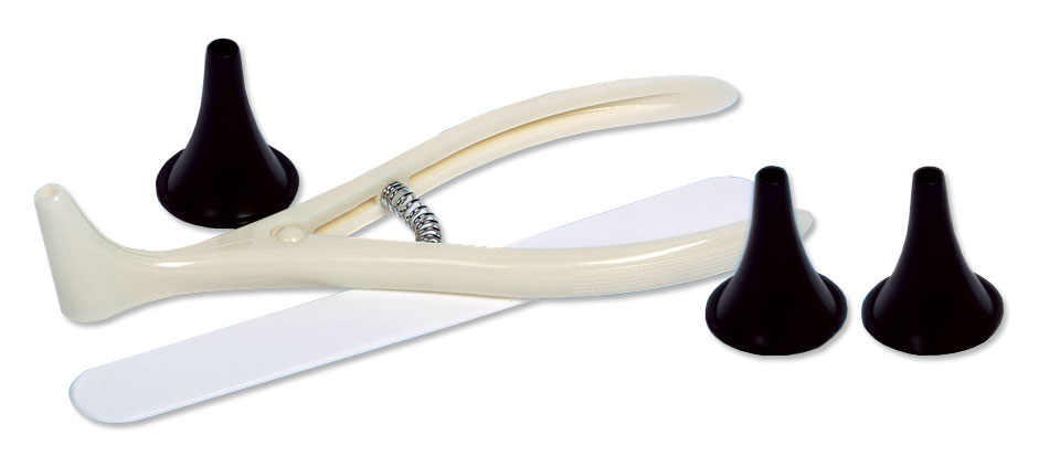 Kit estéril que incluye un espéculo nasal de plástico, un bajalengua de plástico y dos espéculos auriculares de plástico (uno para adulto y otro pediátrico).