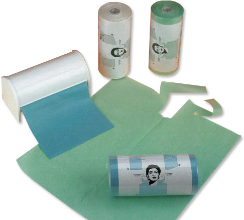 Rollo de baberos para odontología en dos capas, una de celulosa ultra absorbente y uno de polietileno resistente al agua.