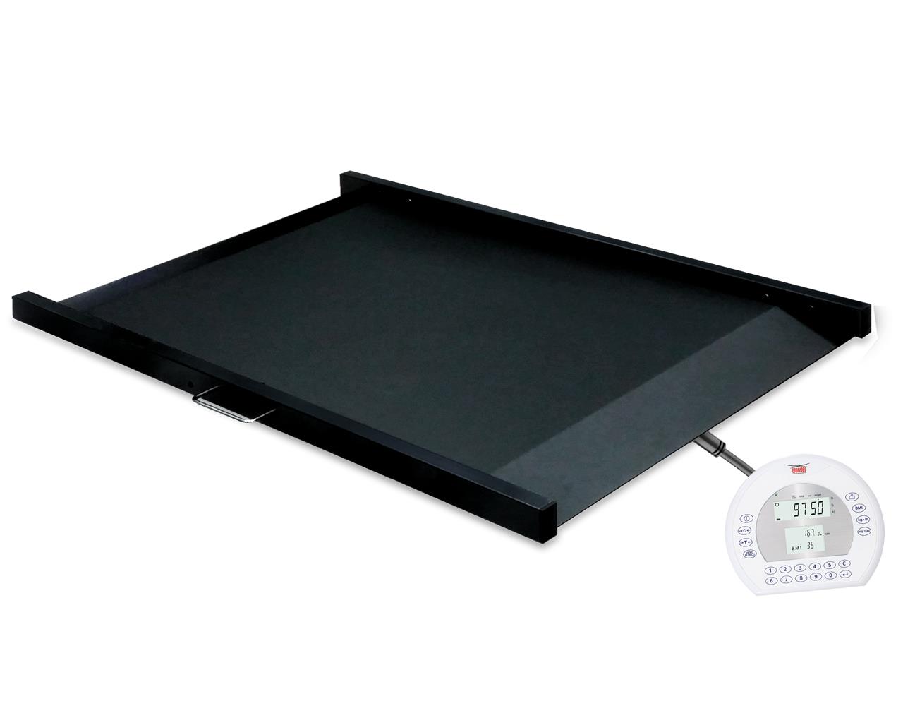 Báscula para sillas de ruedas digital con plataforma amplia y de fácil acceso gracias a la doble rampa de subida/bajada, ideal para pesar pacientes en silla de ruedas. Equipado con doble pantalla de ABS para lectura simultánea de: peso, altura e IMC.