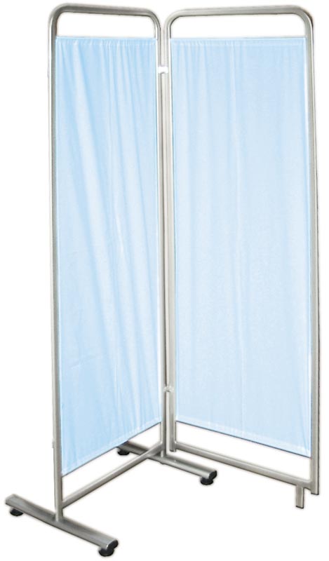 Biombo de dos cuerpos con estructura tubular resistente y pintada con polvos epóxicos de color gris metal.