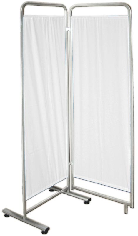 Biombo de dos cuerpos con estructura tubular resistente y pintada con polvos epóxicos de color gris metal.