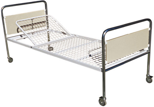Sencilla cama de hospital con ruedas. Somier con red rígida; patas antideslizantes y respaldo regulable.