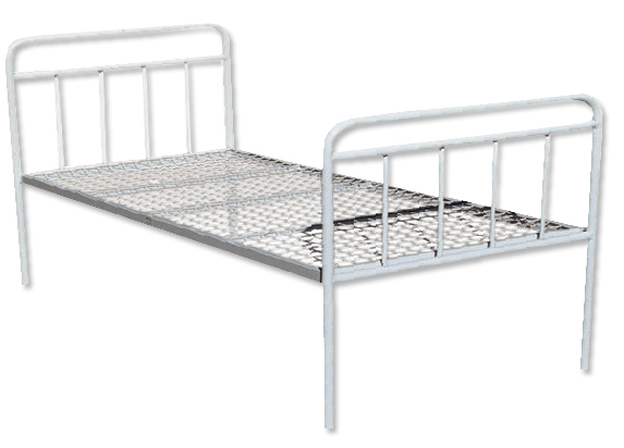 Cama de hospital GIMA modelo estándar construida en acero recubierto con polvo epóxico. Diseñada como cama de red plana no movilizada (sin ruedas) con una base rígida para el colchón y cabecera y piecera equipados con pies de material plástico.