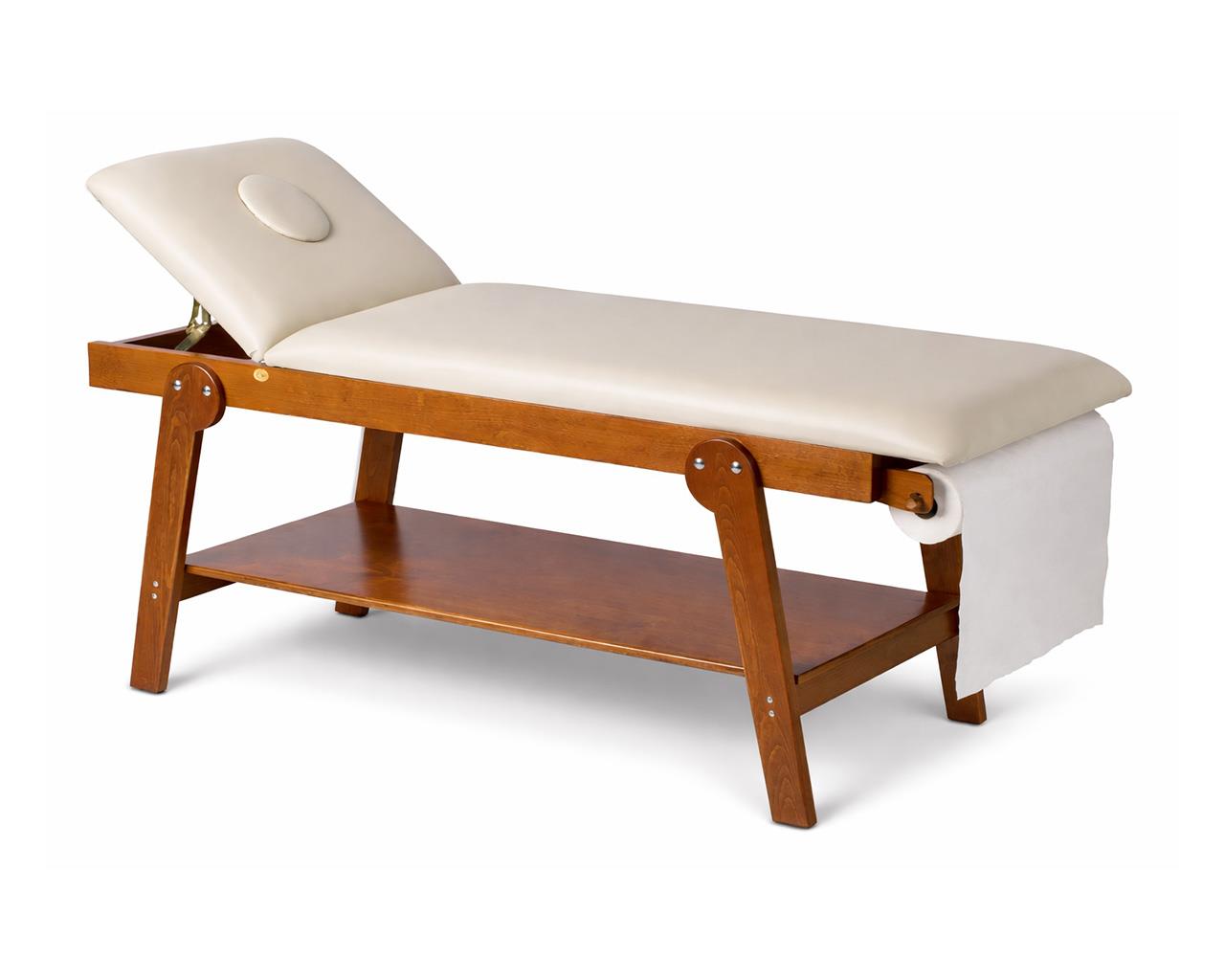 El diseño en madera ofrece un acabado estético adecuado para estudios y centros que requieren un mobiliario cuidado, manteniendo al mismo tiempo funcionalidades clínicas: agujero facial con tapón para tratamientos que requieren posicionamiento prono, soporte de sábanas incluido y acolchado resistente para sesiones prolongadas.