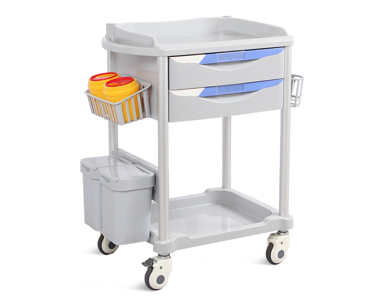 Carro de tratamiento en ABS y material antibacteriano al exterior, con estructura interna de acero y aluminio.