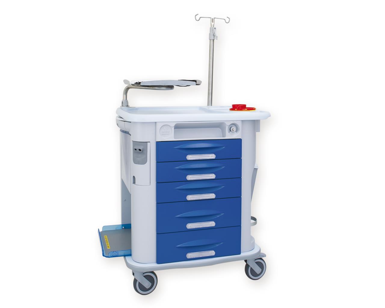 Carro de emergencias Aurion de color azul. Con 5 cajones, portagoteros, bandeja para desfibrilador, bandeja para unidad de aspiración, tabla para la reanimación cardiopulmonar, toma de corriente.