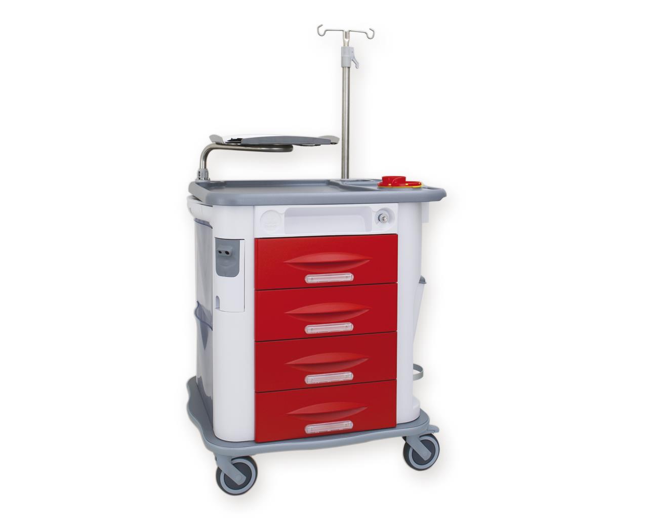 Carro de emergencias Aurion de color rojo. Con 4 cajones, portagoteros, bandeja para desfibrilador y tabla para la reanimación cardiopulmonar.