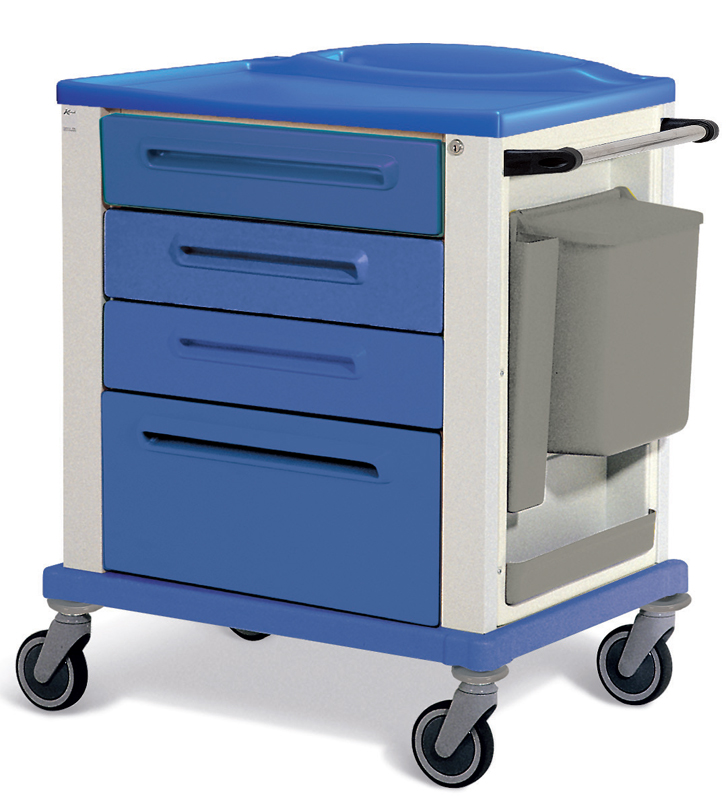 Carro profesional multifuncional con estructura sólida y robusta en el que se utilizan componentes de plástico (tecnopolímeros) y chapa de acero pintada con polvos epoxídicos para garantizar la máxima ligereza, capacidad de maniobra y facilidad de uso.