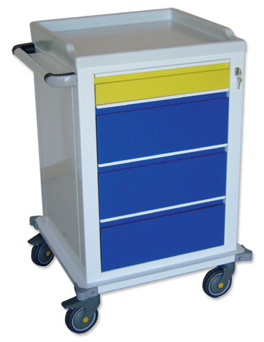 Carro modular de acero pintado, con estructura autoportante y monobloque, parte superior con amplio plano de apoyo de material plástico tecnopolímero. Caracterizado por tres lados de contención y sin esquinas agudas para facilitar la limpieza.