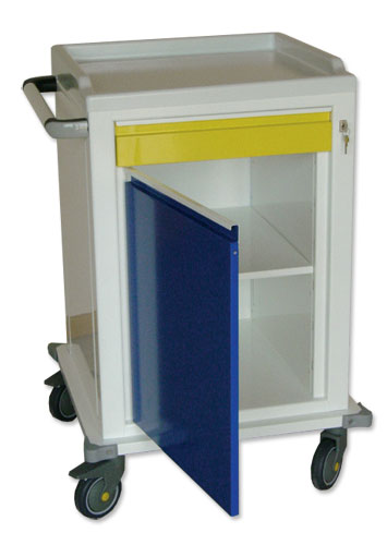 Carro modular de acero pintado, con estructura autoportante y monobloque, parte superior con amplio plano de apoyo de material plástico tecnopolímero. Caracterizado por tres lados de contención y sin esquinas agudas para facilitar la limpieza.