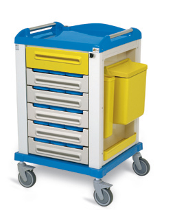 Carro portamedicamentos con estructura sólida y robusta en el que se utilizan componentes de plástico (tecnopolímeros) y chapa de acero pintada con polvos epoxídicos para garantizar la máxima ligereza, capacidad de maniobra y facilidad de uso.
