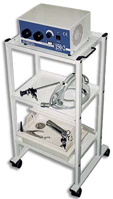 Práctico carro de tres alturas en chapa barnizada al fuego, ideal para pequeños aparatos de electromedicina, como ECG, fuentes de luz, electrobisturís, etc.