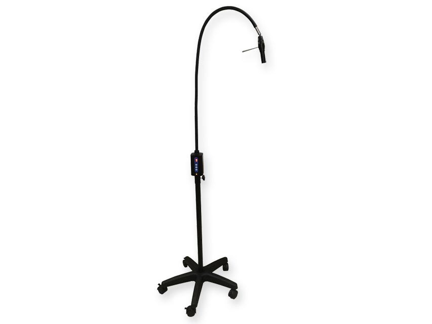 Lámpara de exploración médica con iluminación de LED con objetivo multi-óptico y sistema de regulación luminosa "Spot-Adjusted" directamente desde empuñadura. Dispone de un brazo flexible muy largo (100 cm) y empuñadura de acero inoxidable.