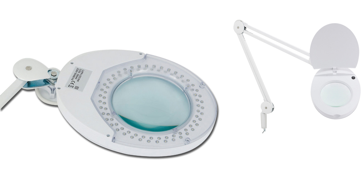 Lámpara de observación modelo LUPA HF con sistema de iluminación de LED de luz fría. Extremadamente versátil y cómoda de utilizar gracias a la lente de aumento de 5 dioptrías.