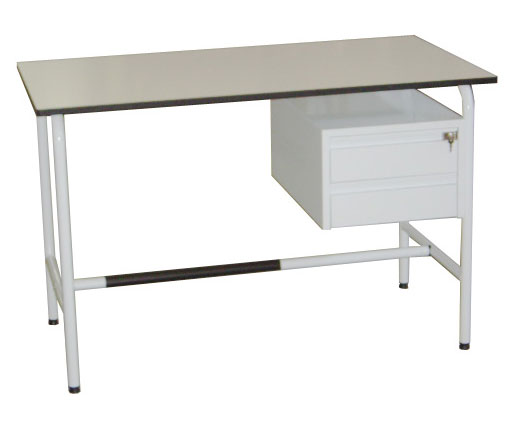 Escritorio de 2 cajones laterales de los cuales, el primero está dotado de cierre con llave. Estructura de tubular de metal esmaltado.