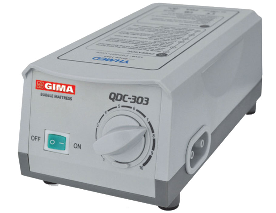 Compresor silencioso con excelente regulación de la presión mediante mando. Con dos ganchos para fijarlo a cualquier estructura de cama hospitalaria.