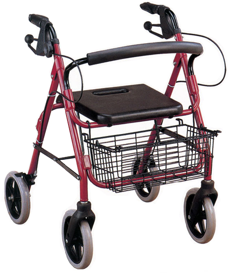 Andador con asiento y cesto espacioso en la parte delantera. Provisto de ruedas con freno. Plegable.