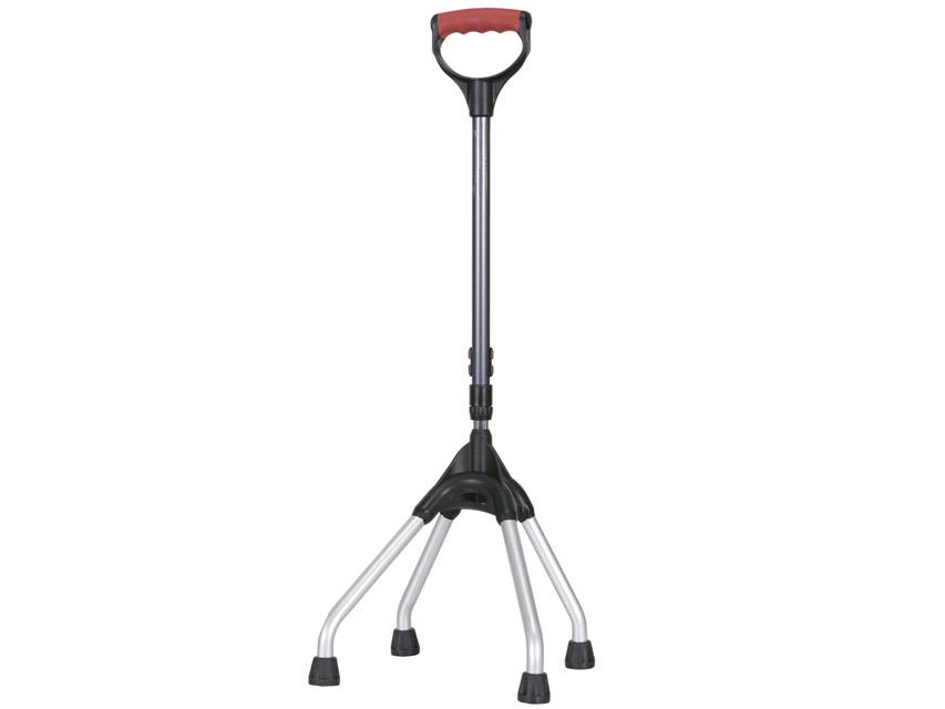 Cuadrípode con empuñadura de anillo, diseñado especialmente para ser un auxilio para las personas con problemas de deambulación que necesitan de un apoyo estable y más seguro respecto a un bastón tradicional.