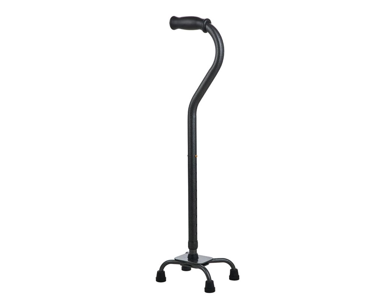Cuadrípode de base estrecha con empuñadura abierta, anatómica. Totalmente fabricado en aluminio ligero pintado. Puntas antideslizantes de goma blanda.