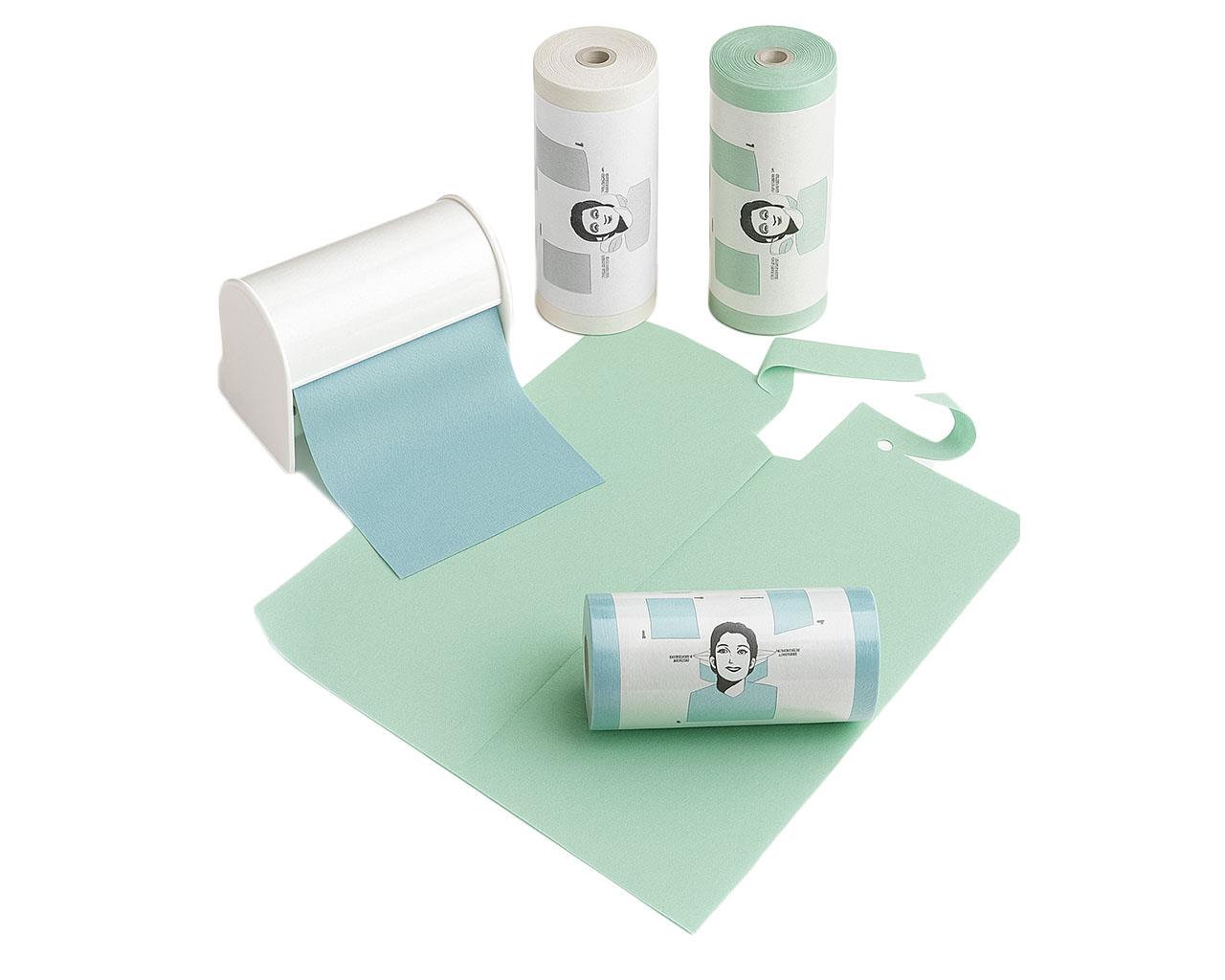 Rollo de baberos para odontología en dos capas, una de celulosa ultra absorbente y uno de polietileno resistente al agua.
