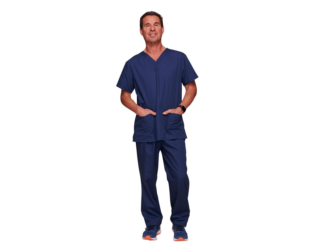 Uniforme unisex Cherokee WorkWear Originals compuesto por una casaca con cuello en V y pantalones con cordón en la cintura, confeccionado en un tejido duradero y resistente a las manchas.