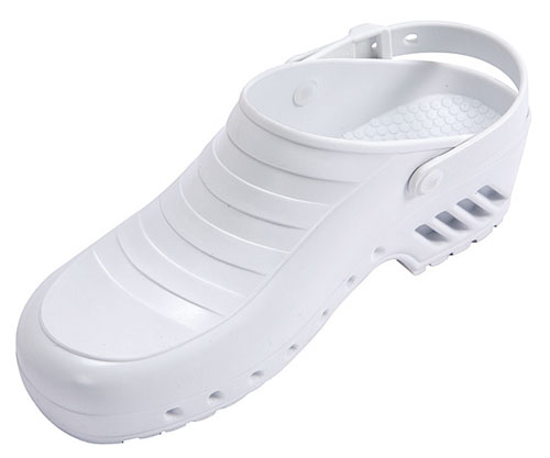 Zuecos profesionales de color blanco lisos con correa de seguridad. Fabricados en Italia. Conformes a los requisitos esenciales y a las disposiciones del Reglamento (UE) 2017/745 (MDR).