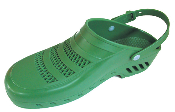 Zuecos profesionales de color verde con empeine perforado y correa de seguridad. Fabricados en Italia. Conformes a los requisitos esenciales de la directiva 93/42/CEE anexos VII y IX.