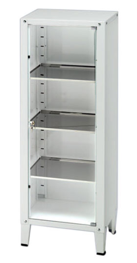 Vitrina médica de acero pintado con una puerta de cristal templado.